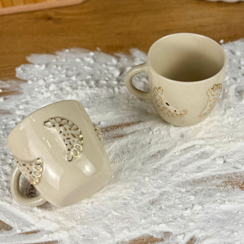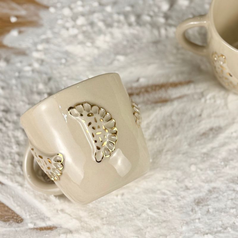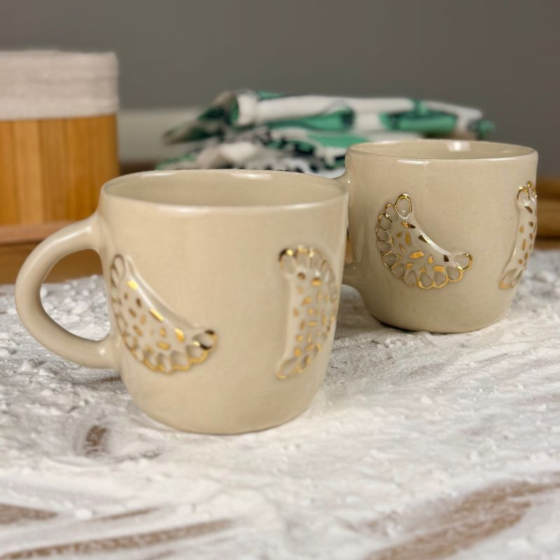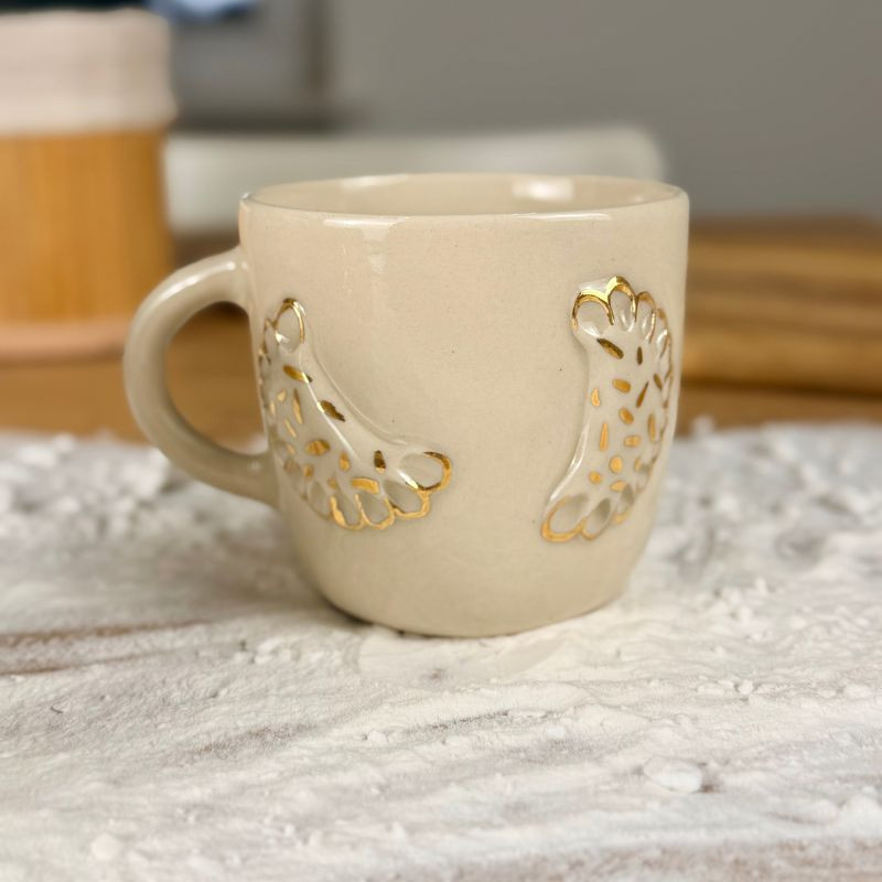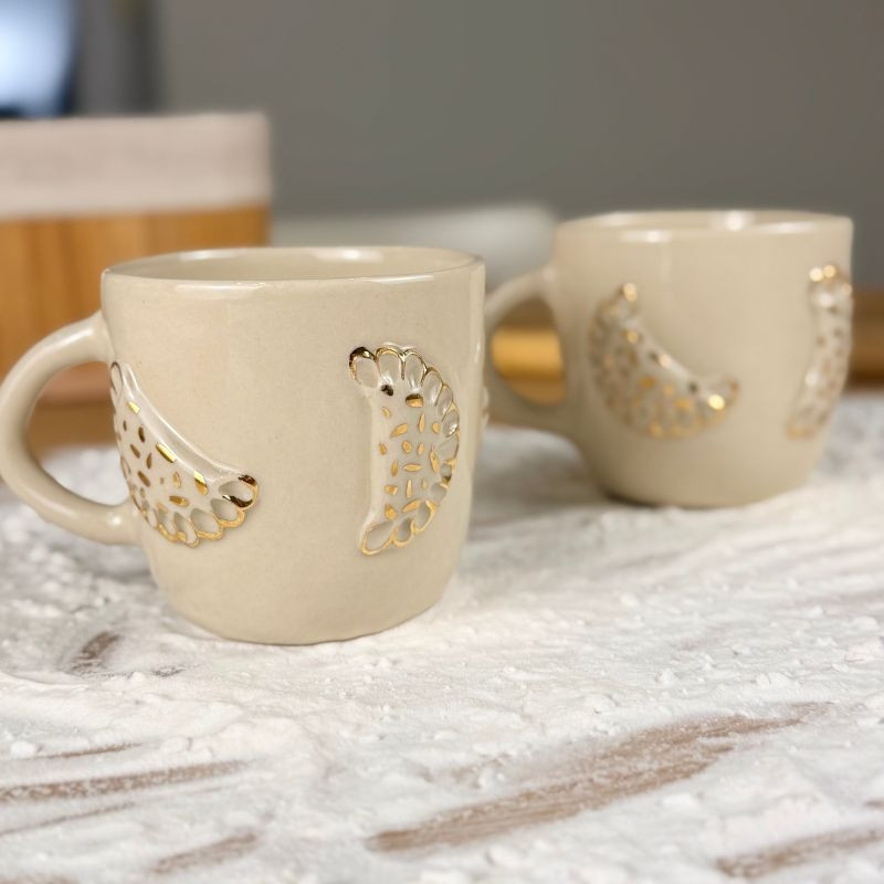 Nie wiadomo, czy bardziej chce się z niego pić, czy zjeść – ale jedno jest pewne: to pieróg, który nie tuczy. Ręcznie lepiony jak babcine ruskie, z uchem w szkliwie transparentnym i wypukłym pierogiem, który z dumą wychodzi poza kubek. Złote zdobienia dodają mu nieco blichtru.